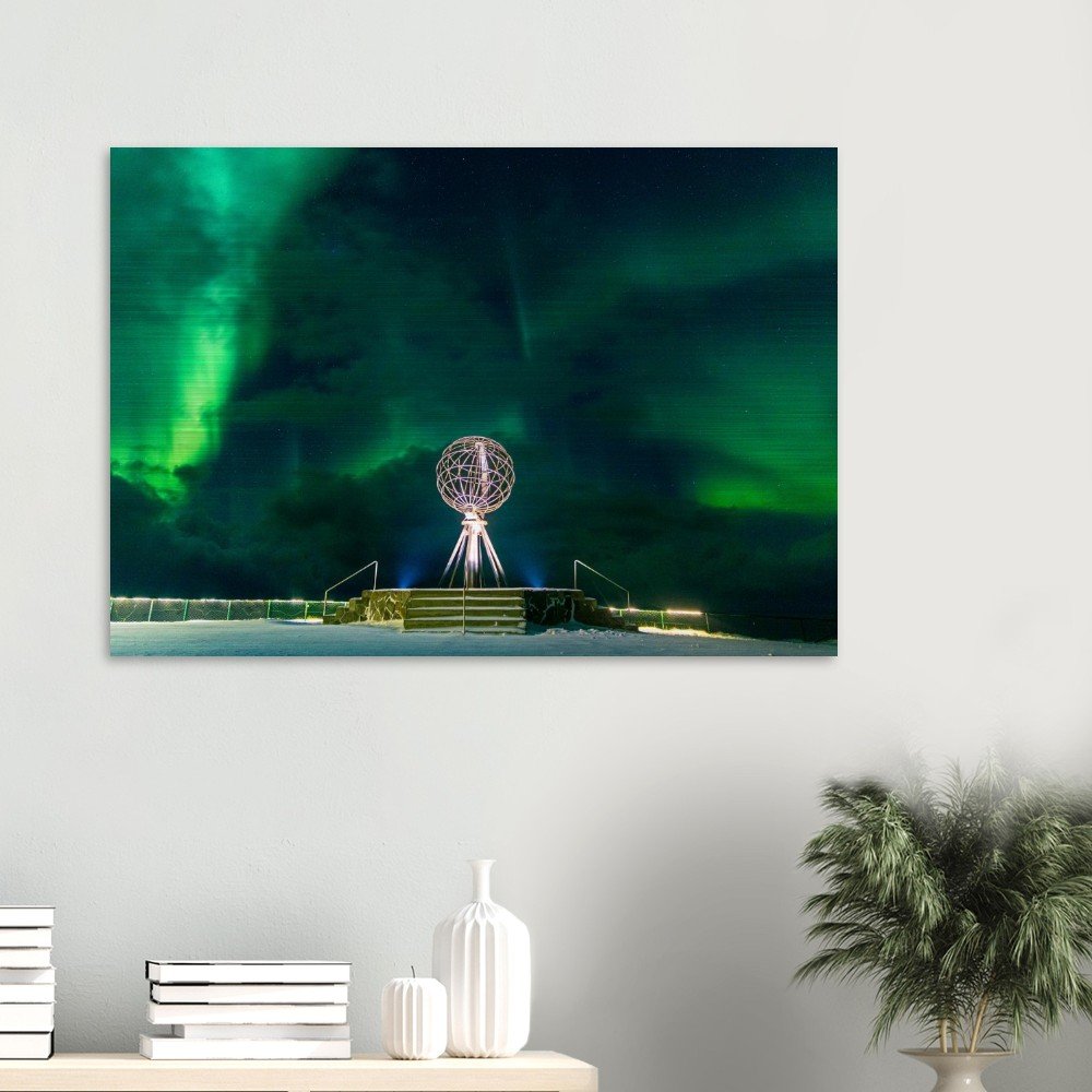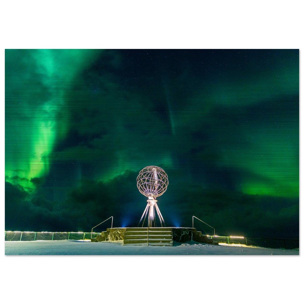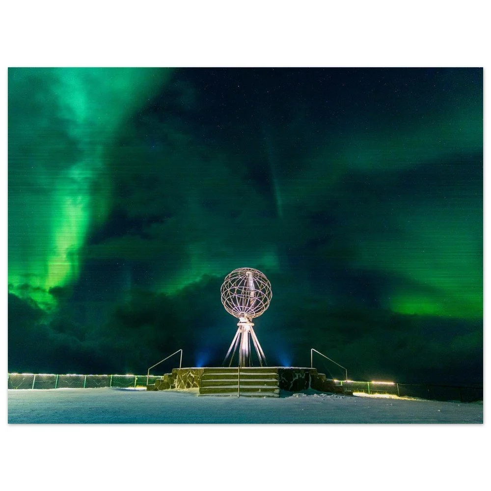 Experience the breathtaking beauty of the Arctic with our Aluminum Print featuring the mesmerizing Northern Lights dancing over the iconic globe monument at North Cape. This stunning piece not only captures the ethereal colors of nature but also transforms any space into a serene Arctic landscape.