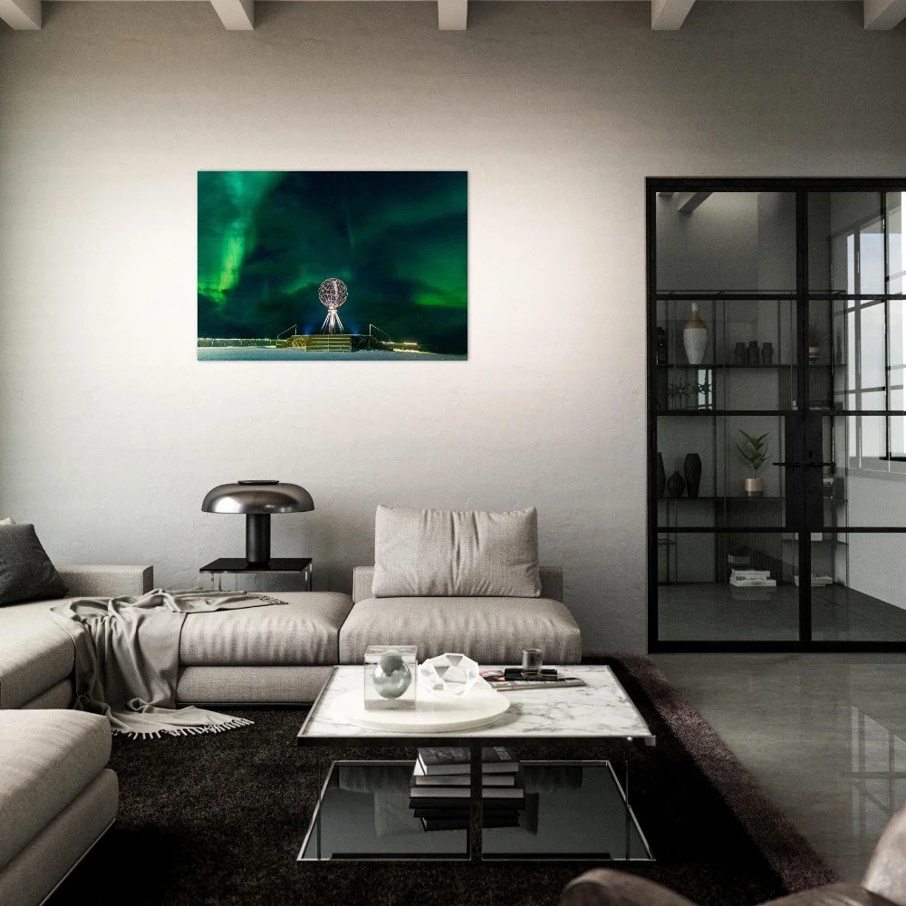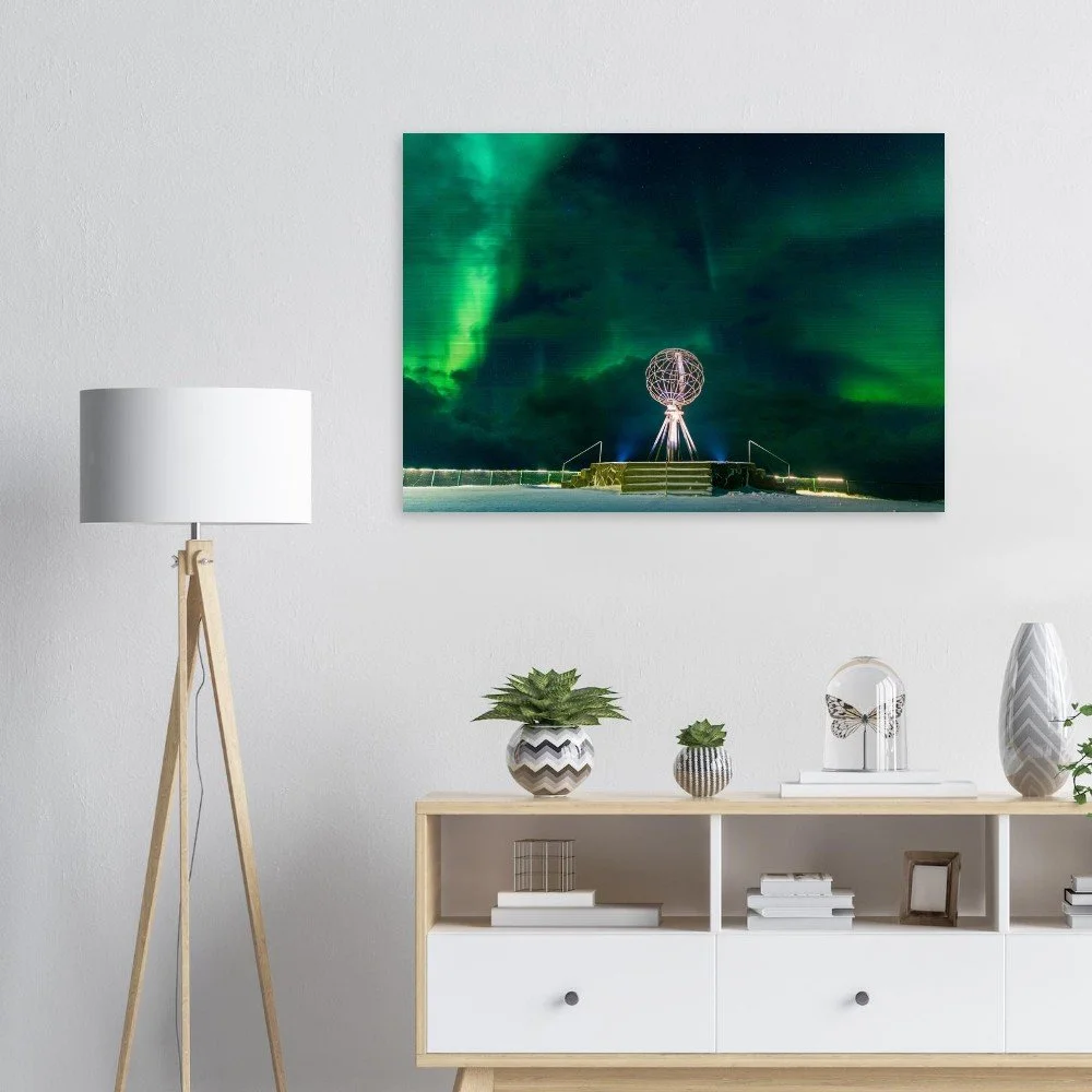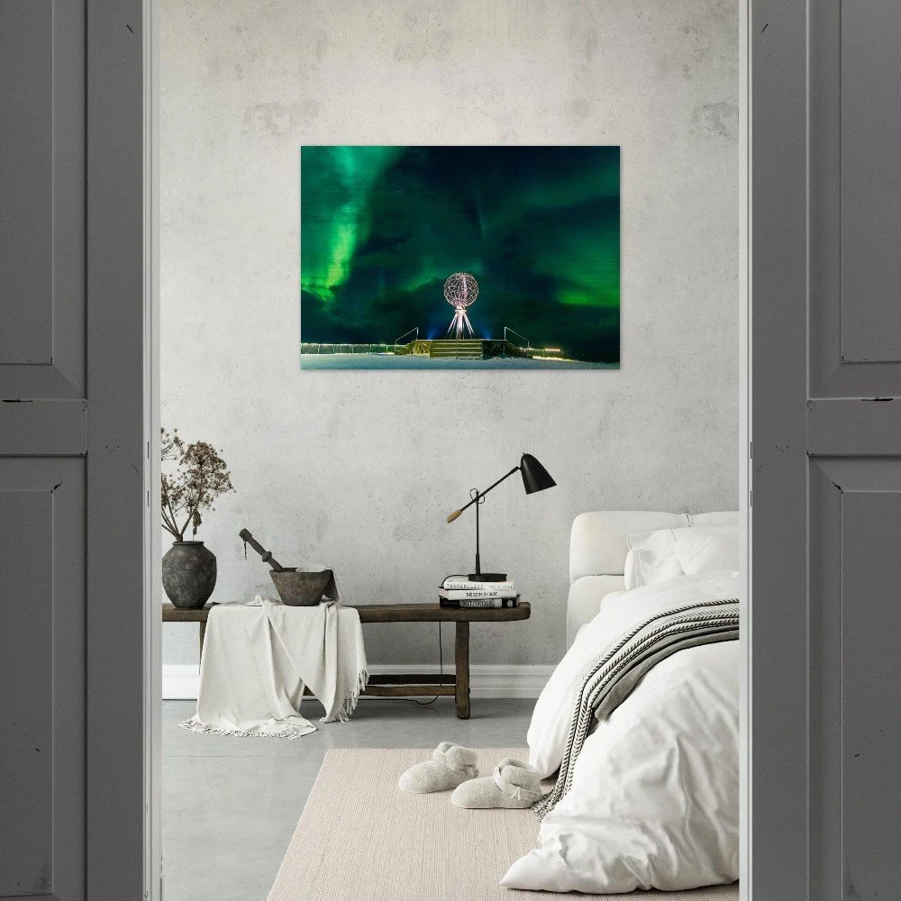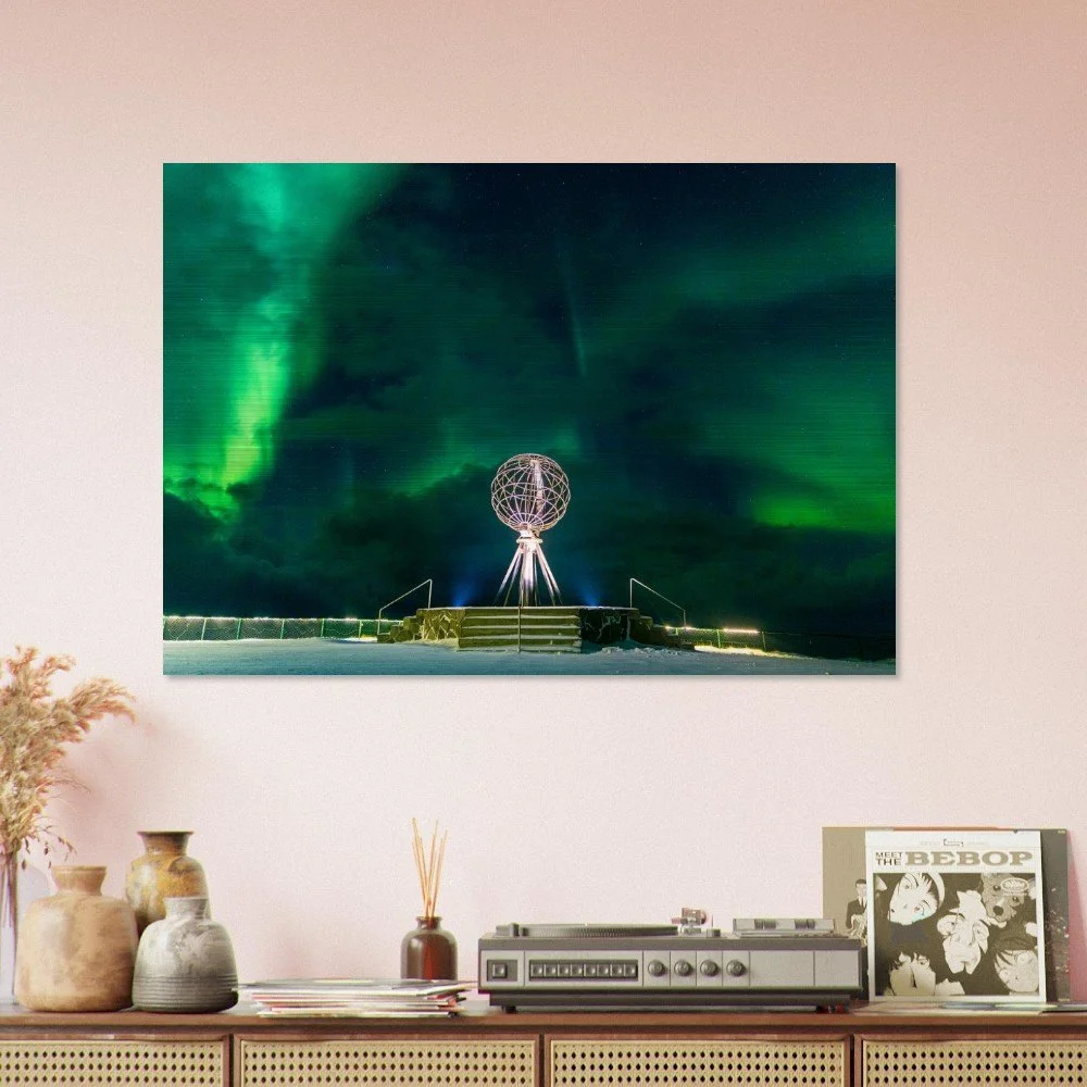 Experience the breathtaking beauty of the Arctic with our Aluminum Print featuring the mesmerizing Northern Lights dancing over the iconic globe monument at North Cape. This stunning piece not only captures the ethereal colors of nature but also transforms any space into a serene Arctic landscape.