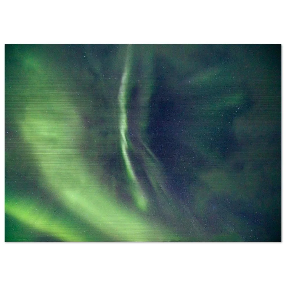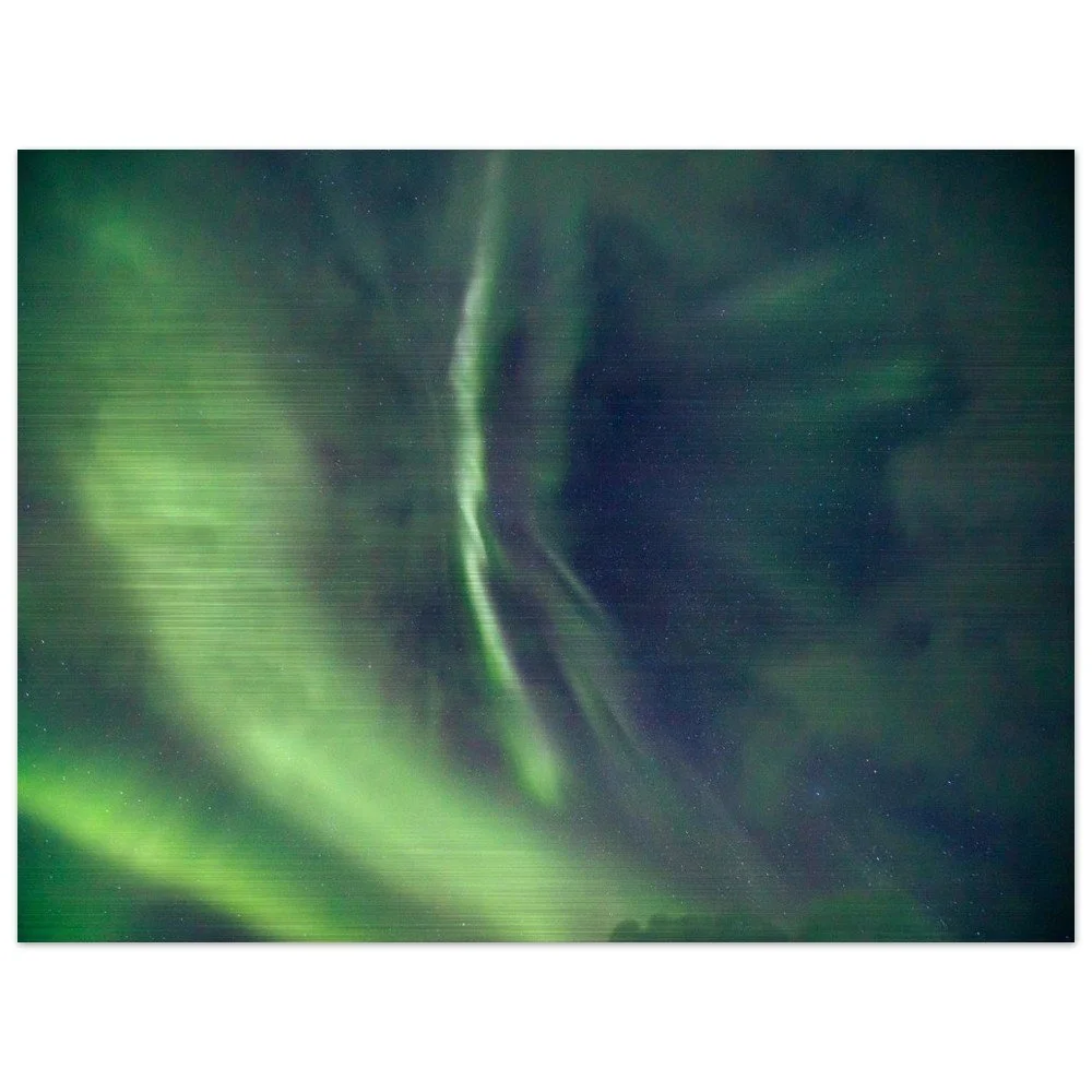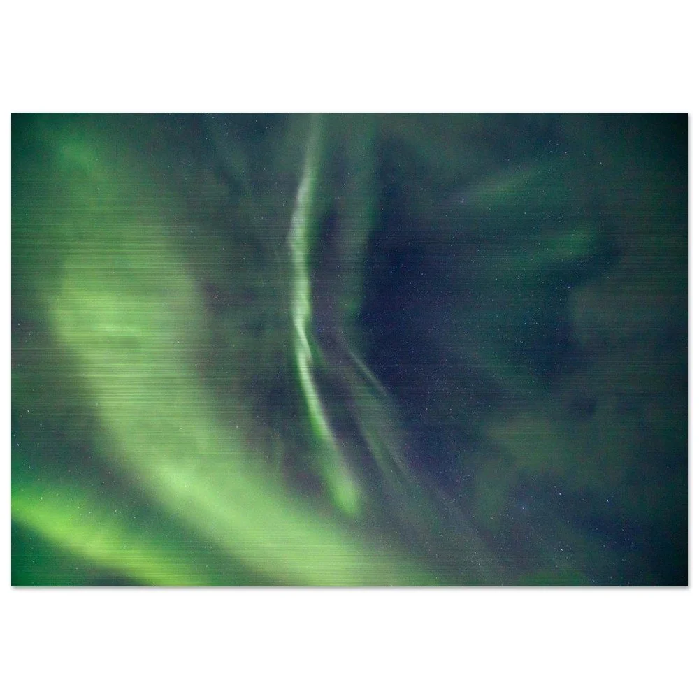 Transform your space with our stunning Aurora Borealis Aluminum Print, showcasing a sweeping arc of green lights illuminating the night sky. This mesmerizing artwork brings the beauty of nature into your home, blending seamlessly with any decor. Crafted from brushed DIBOND® aluminum, also known as AluDibond Butler Finish Silver, this print adds depth and texture to your walls while ensuring a lasting impression.