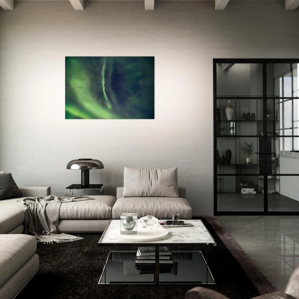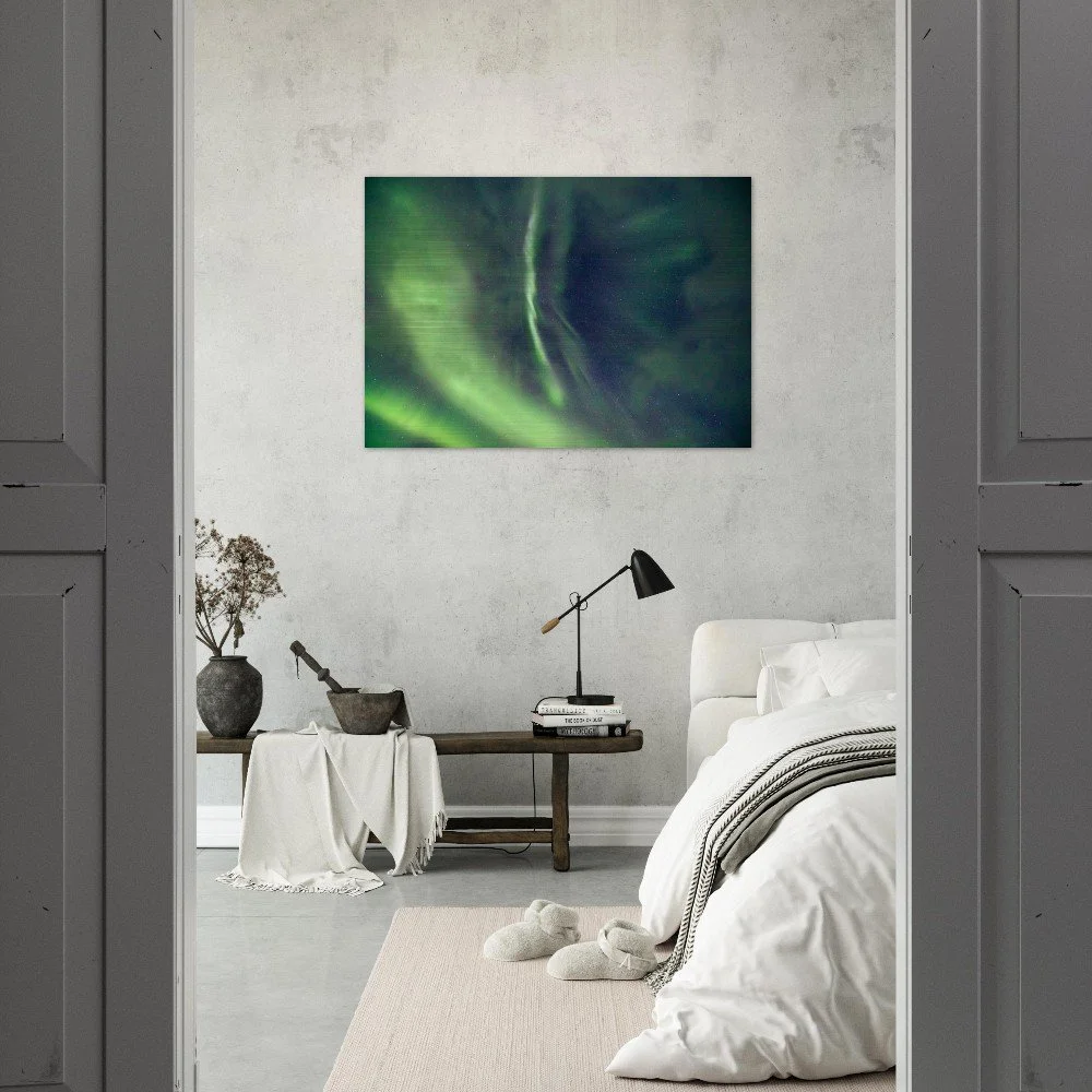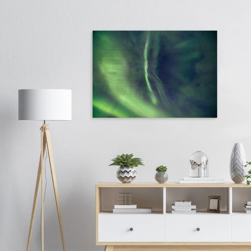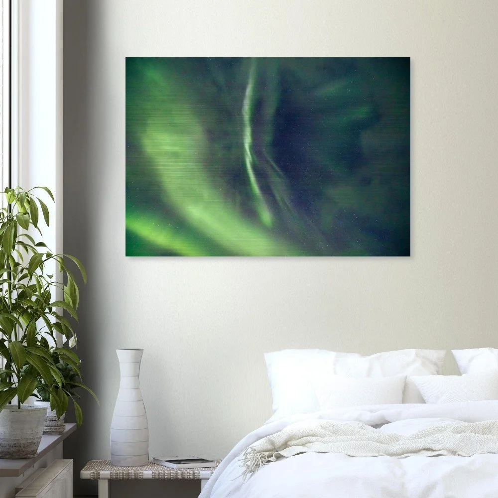 Transform your space with our stunning Aurora Borealis Aluminum Print, showcasing a sweeping arc of green lights illuminating the night sky. This mesmerizing artwork brings the beauty of nature into your home, blending seamlessly with any decor. Crafted from brushed DIBOND® aluminum, also known as AluDibond Butler Finish Silver, this print adds depth and texture to your walls while ensuring a lasting impression.