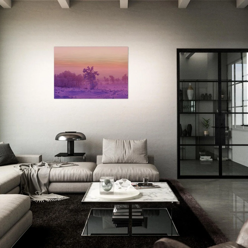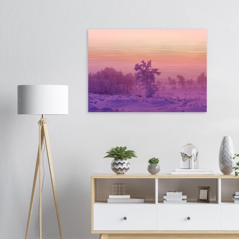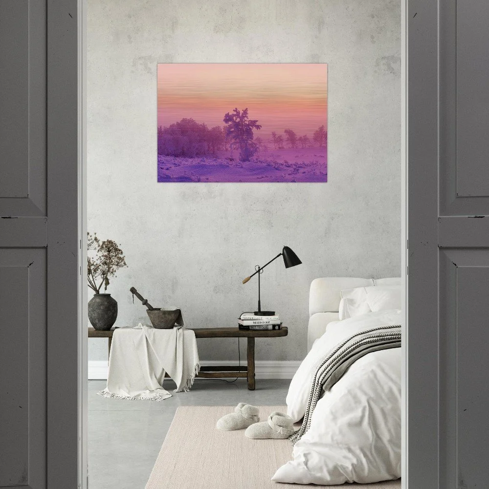 Transform your space with our breathtaking Frost-Covered Tree Aluminum Print. This stunning artwork captures a lone, frost-covered tree standing majestically in a serene snowy landscape, all beneath a dreamy pastel sunrise blending warm pinks and cool purples. Crafted on durable DIBOND® aluminum with a brushed silver metallic finish, it adds depth and texture to any room. With a thickness of 3 mm (0.12”), this lightweight piece showcases vibrant colors thanks to direct printing technology, while the matte finish eliminates glare. Each piece comes with an easy-to-install hanging set tailored to your location. Available in 18 sizes, this art piece is perfect for enhancing your home or office decor. Bring a touch of tranquil beauty to your walls today!