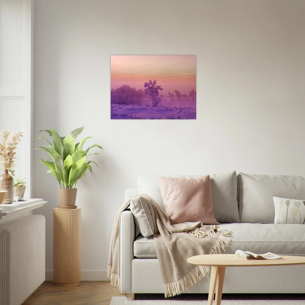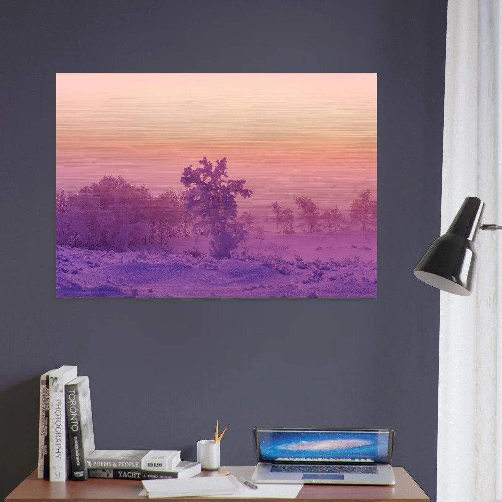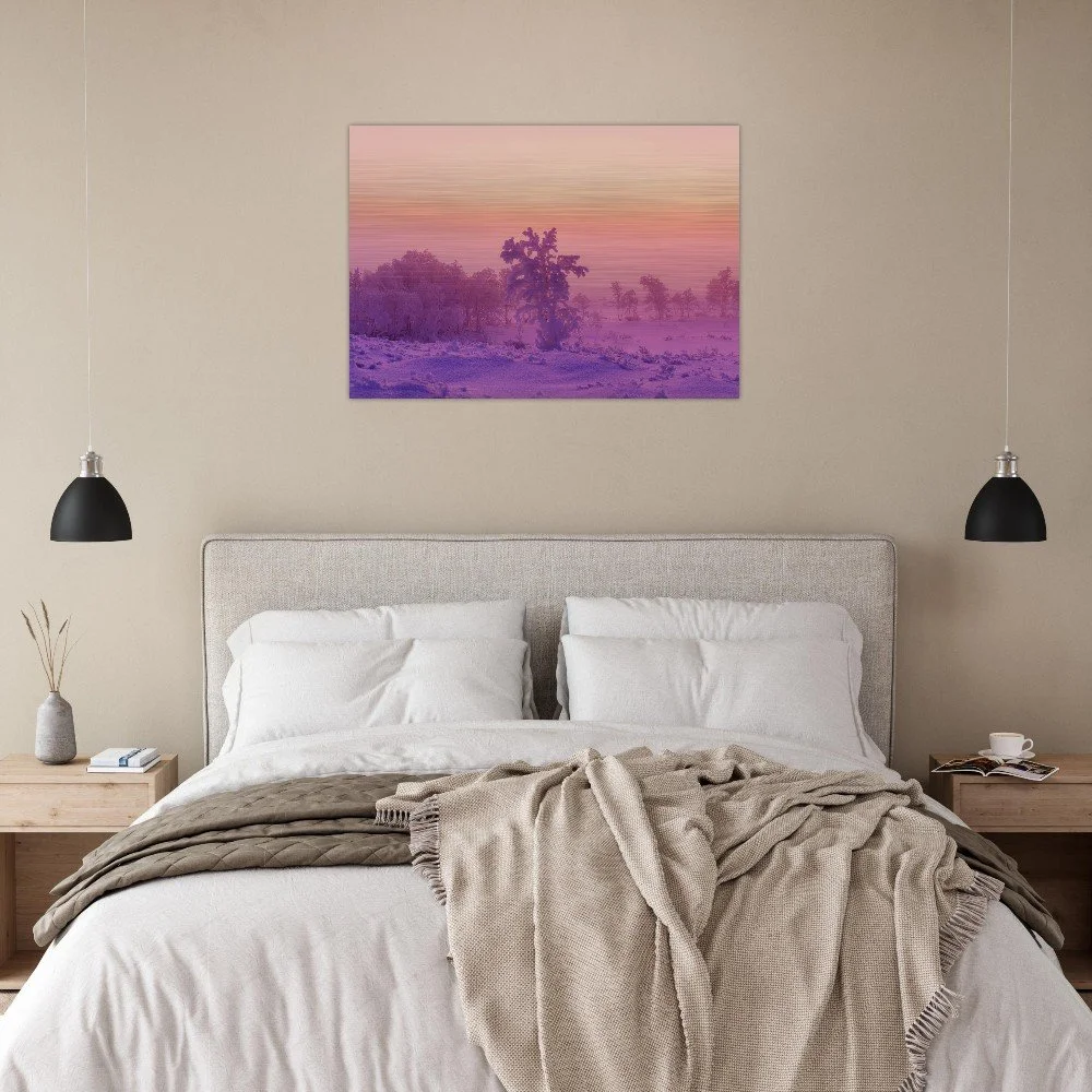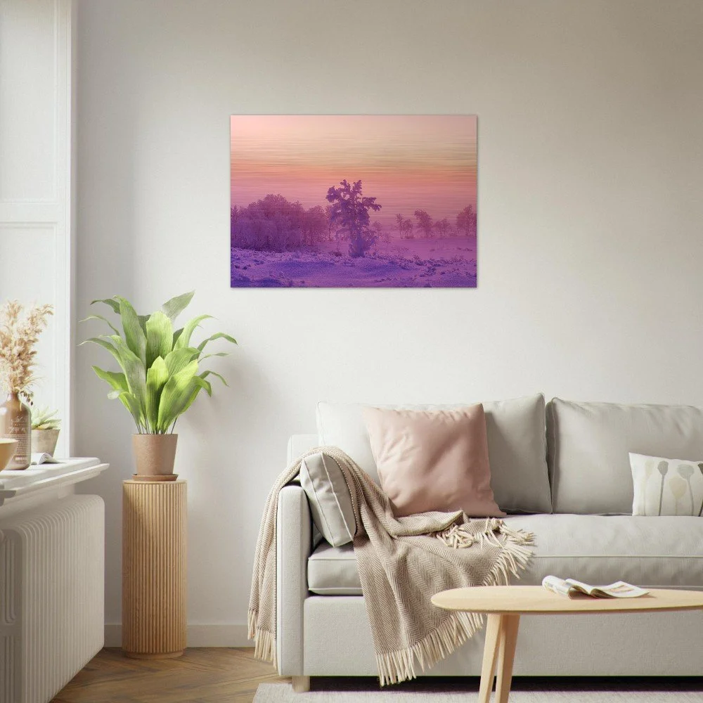 Transform your space with our breathtaking Frost-Covered Tree Aluminum Print. This stunning artwork captures a lone, frost-covered tree standing majestically in a serene snowy landscape, all beneath a dreamy pastel sunrise blending warm pinks and cool purples. Crafted on durable DIBOND® aluminum with a brushed silver metallic finish, it adds depth and texture to any room. With a thickness of 3 mm (0.12”), this lightweight piece showcases vibrant colors thanks to direct printing technology, while the matte finish eliminates glare. Each piece comes with an easy-to-install hanging set tailored to your location. Available in 18 sizes, this art piece is perfect for enhancing your home or office decor. Bring a touch of tranquil beauty to your walls today!