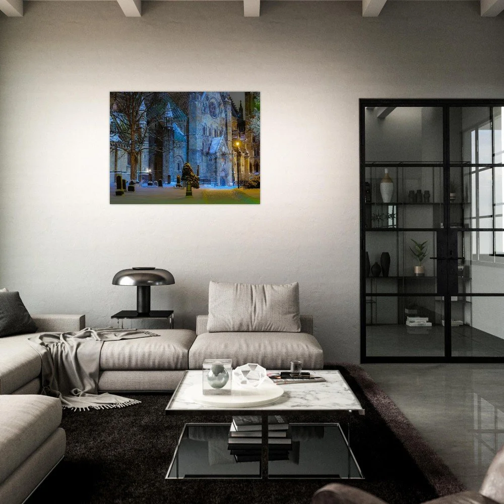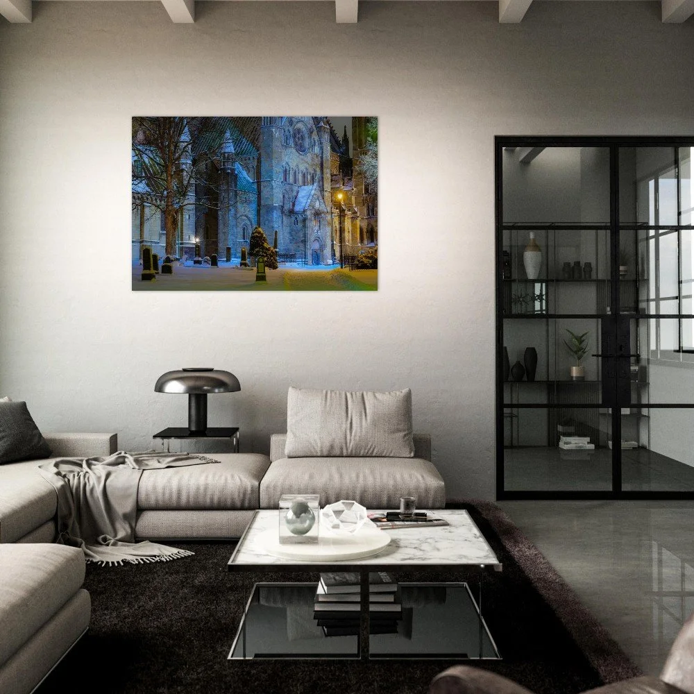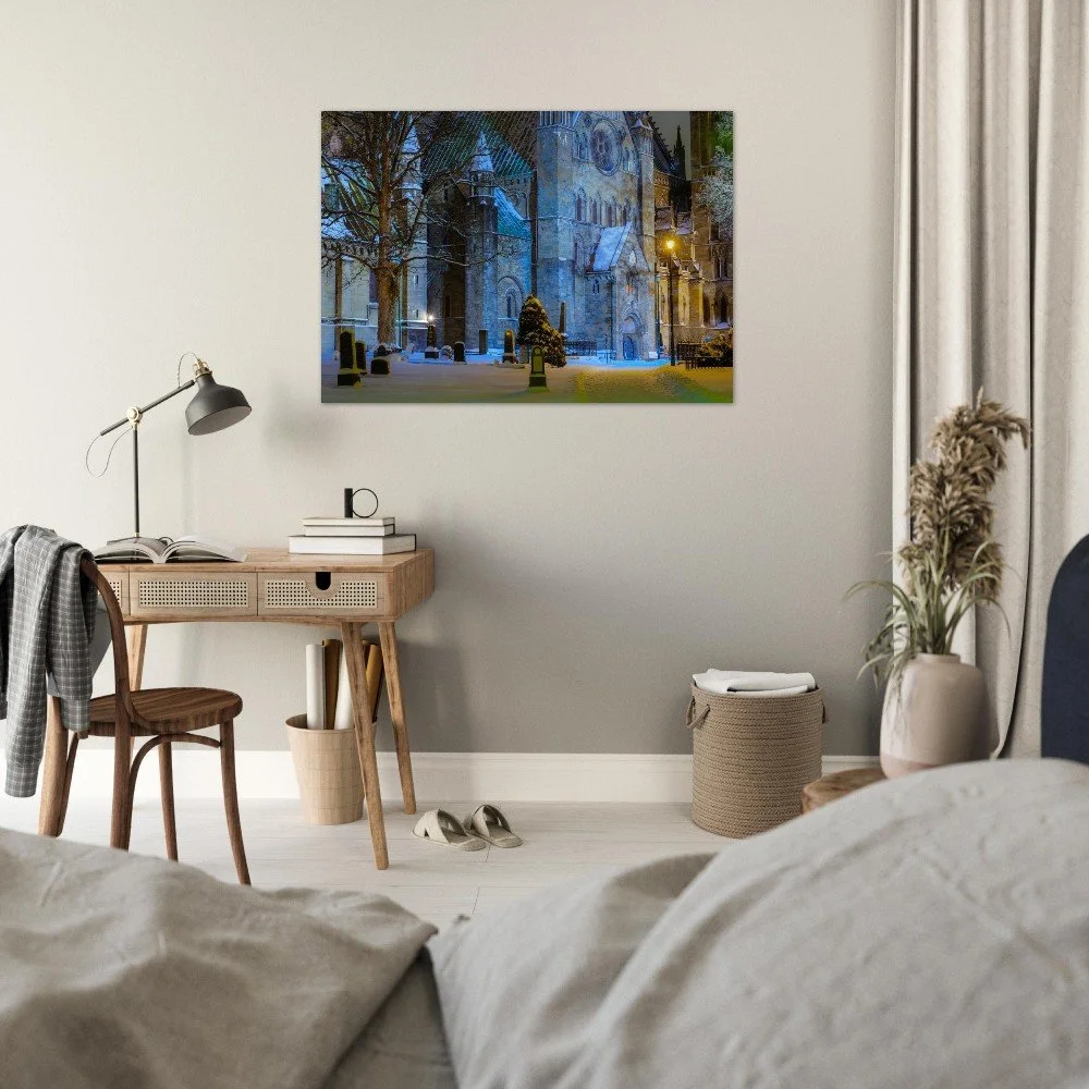 Experience the tranquil beauty of our limited edition fine-art print capturing the enchanting Nidaros Cathedral in a serene winter scene. Bathed in soft blue light and delicate snowfall, this artwork beautifully merges architecture with atmosphere, bringing a sense of calm and depth to your space.