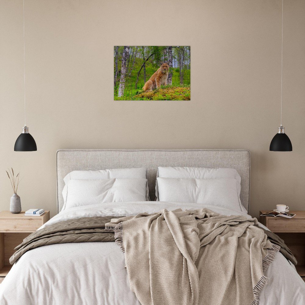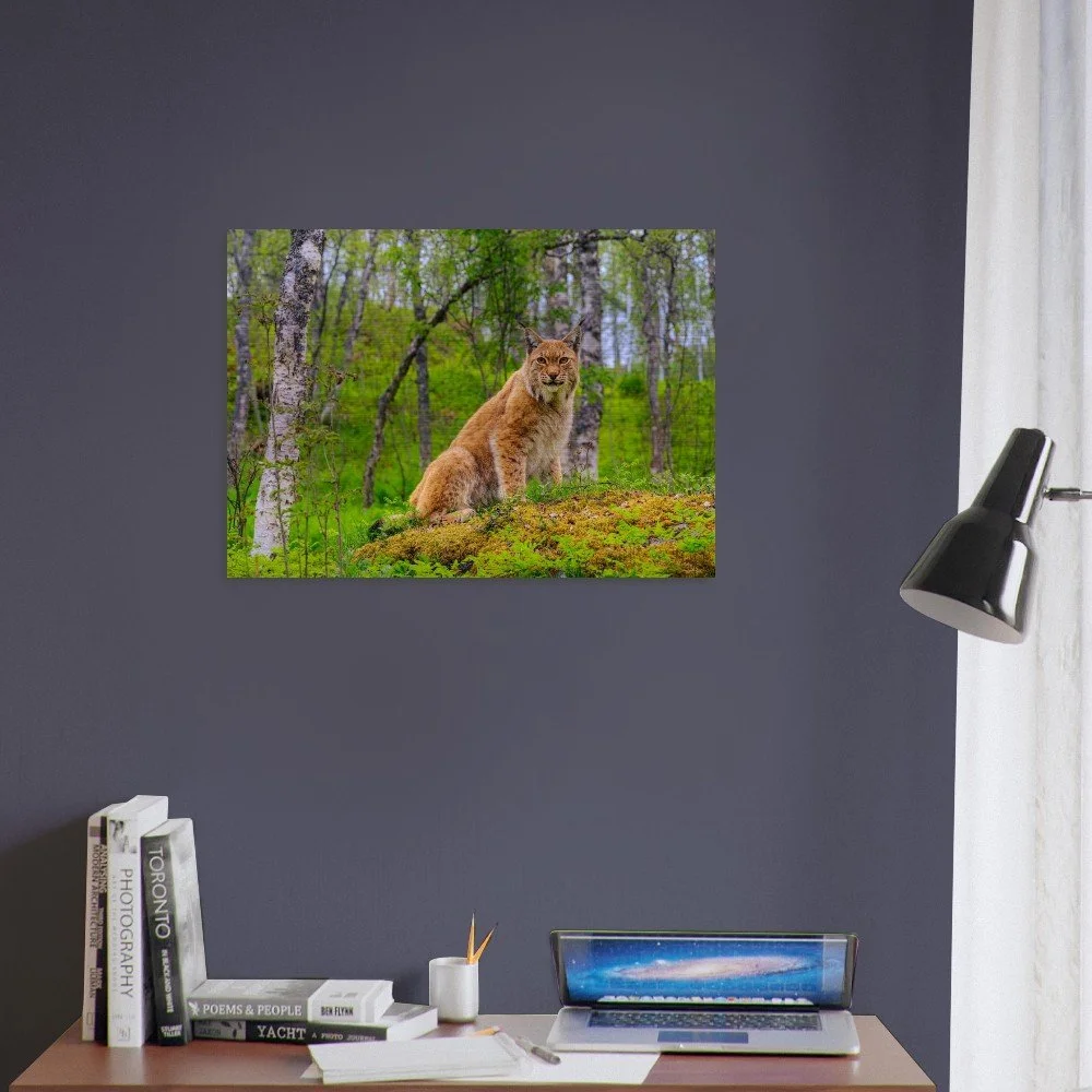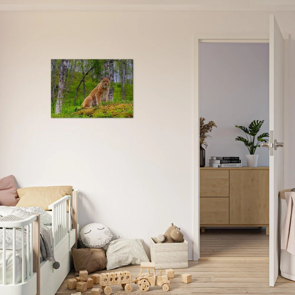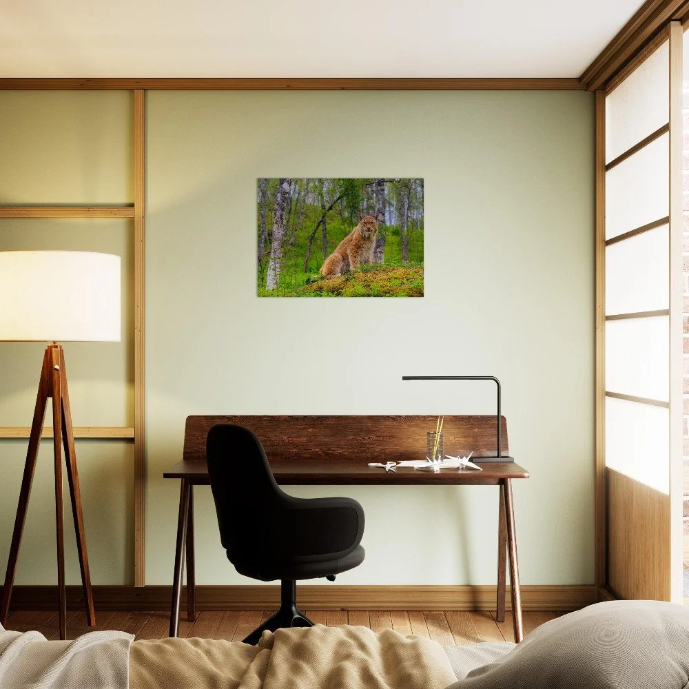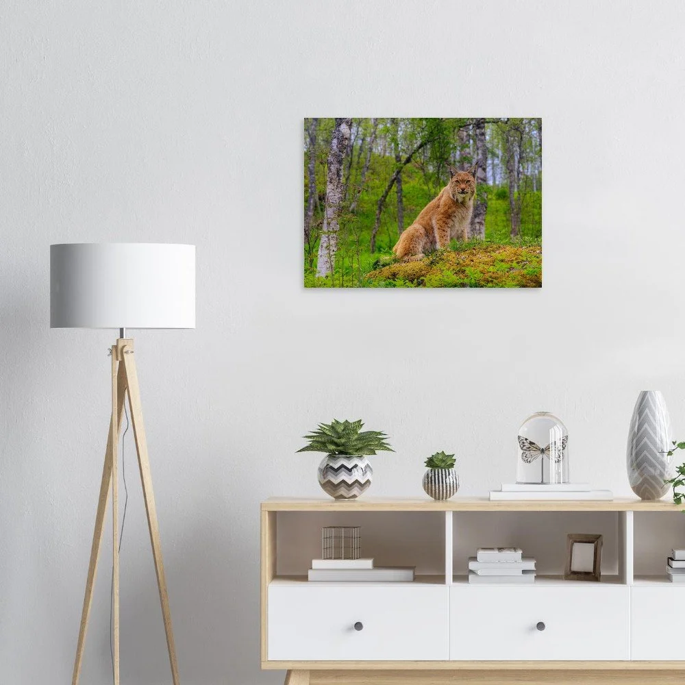 Immerse yourself in nature with our captivating aluminum print featuring a majestic lynx poised on a lush, mossy forest floor. The stunning golden fur of the lynx contrasts beautifully with the fresh green foliage and slender birch trees that frame this enchanting scene. Perfect for animal lovers and nature enthusiasts, this artwork brings the tranquility of the wild into your living space.