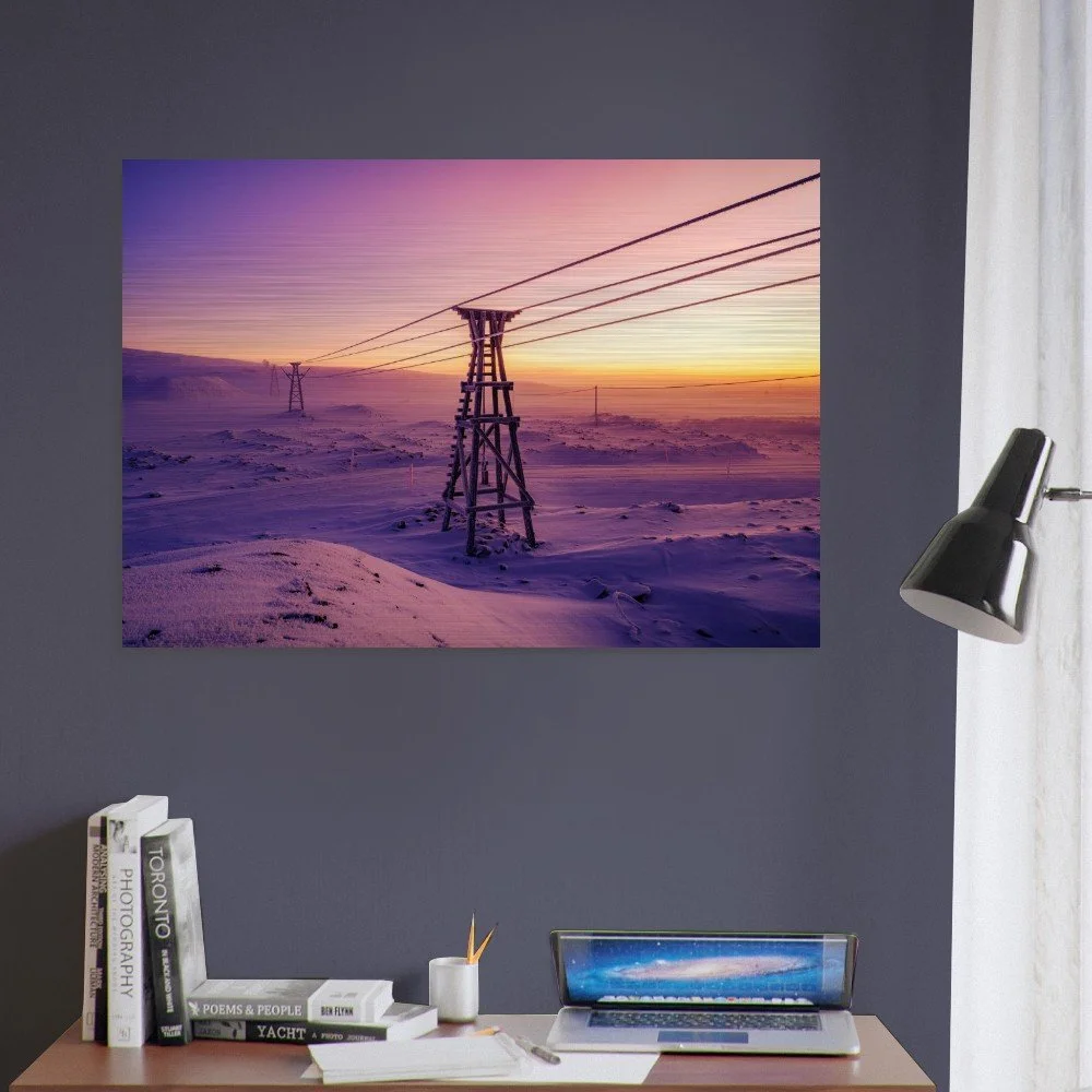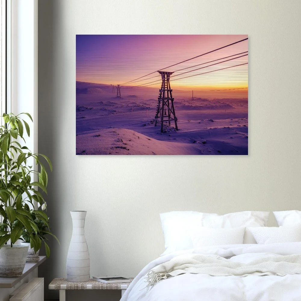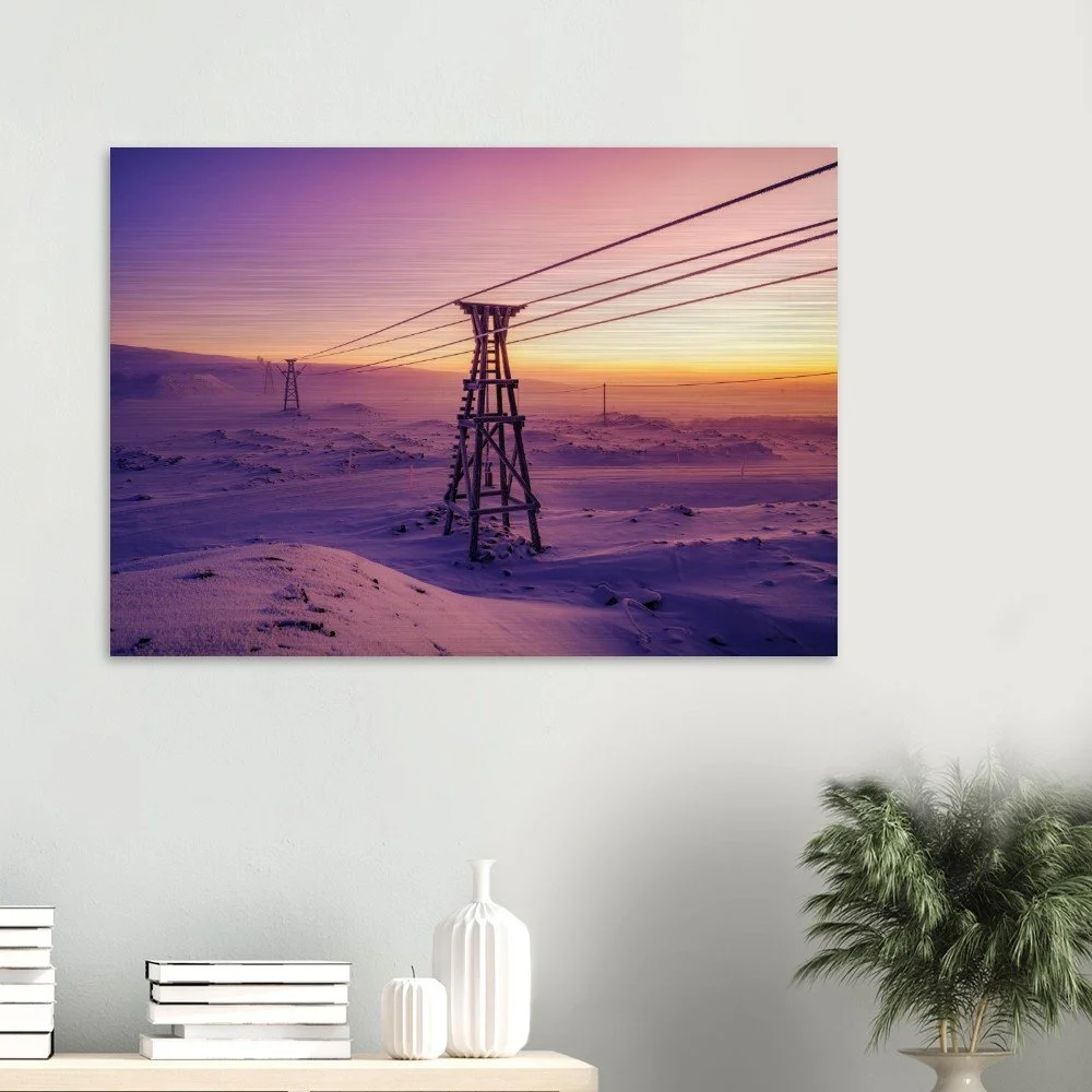 Transform your space with our captivating Wooden mining transportation Tower Art Print, beautifully set against a serene winter landscape and a vibrant sunrise. Printed on premium brushed silver aluminum, this piece boasts a textured, industrial charm, allowing colors to interact with the metallic surface for a striking visual effect.