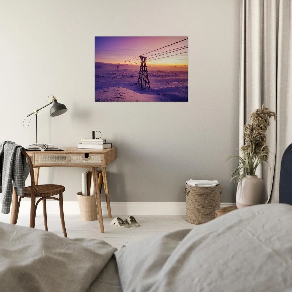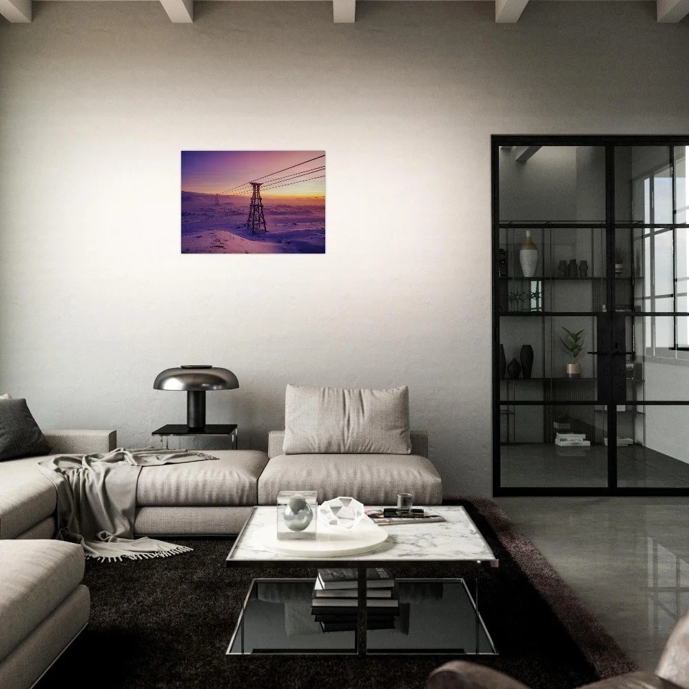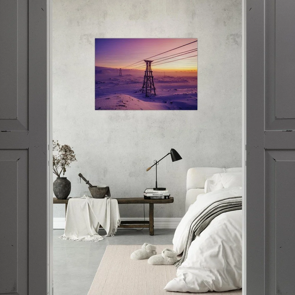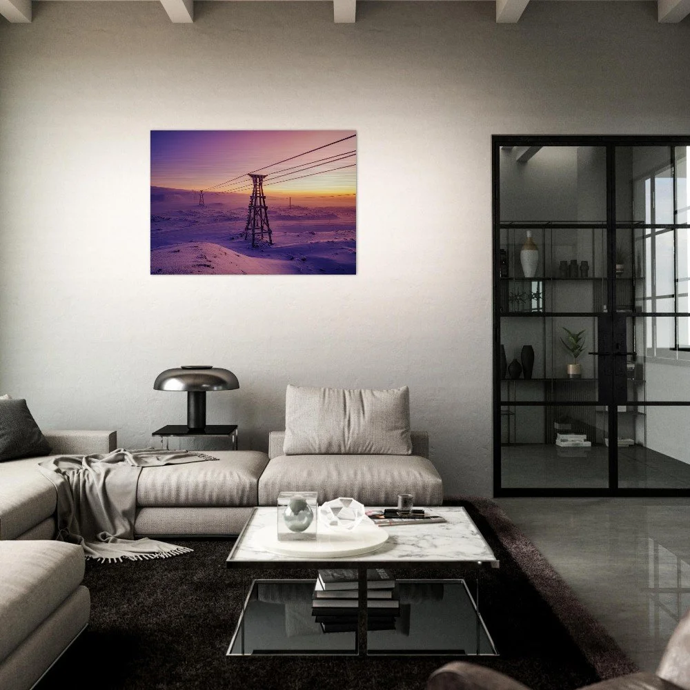 Transform your space with our captivating Wooden mining transportation Tower Art Print, beautifully set against a serene winter landscape and a vibrant sunrise. Printed on premium brushed silver aluminum, this piece boasts a textured, industrial charm, allowing colors to interact with the metallic surface for a striking visual effect.