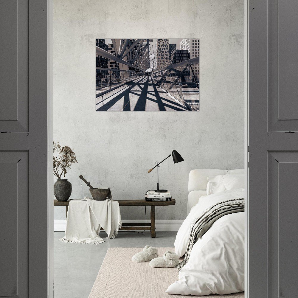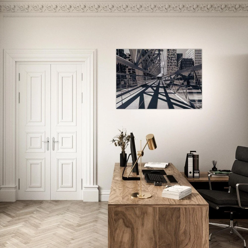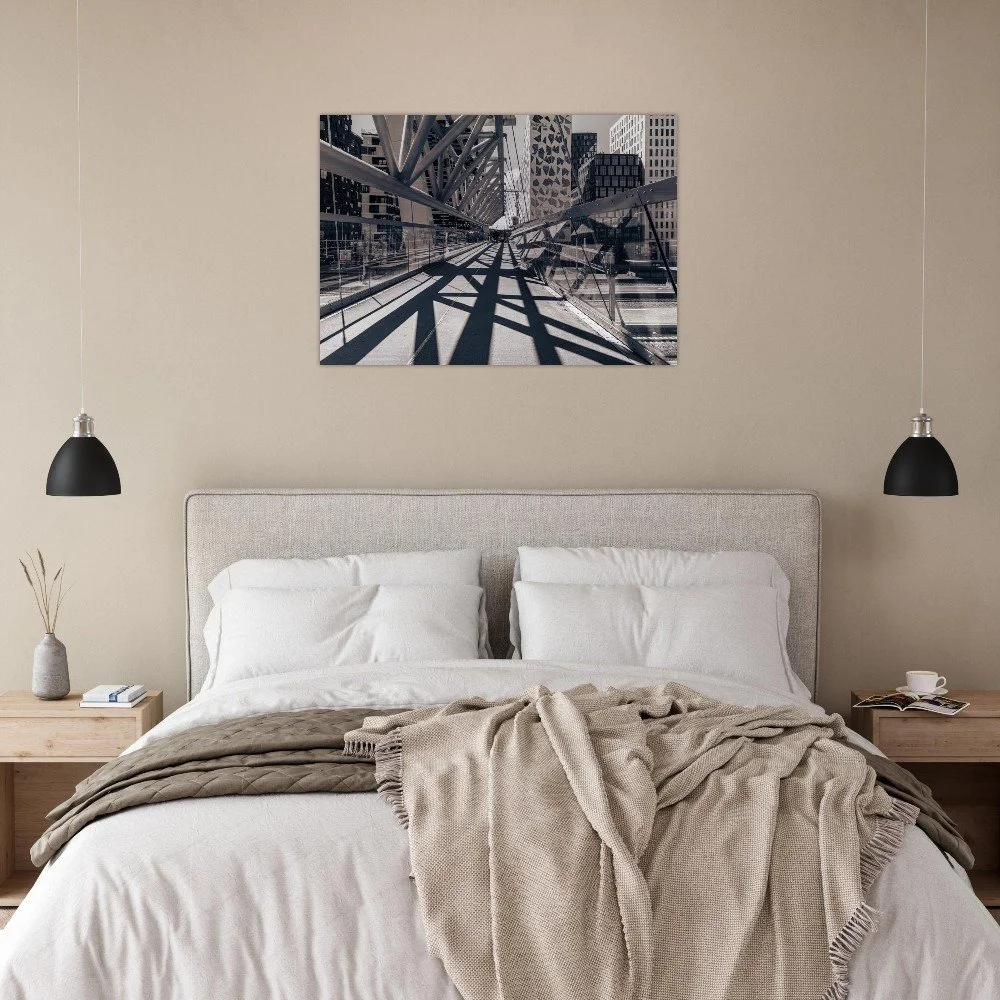 Enhance your space with our stunning aluminum print featuring a modern pedestrian bridge connecting towering city buildings. The dynamic steel beams create bold geometric shadows that dance across the walkway in bright sunlight, bringing a sense of movement and urban energy into your home or office.
