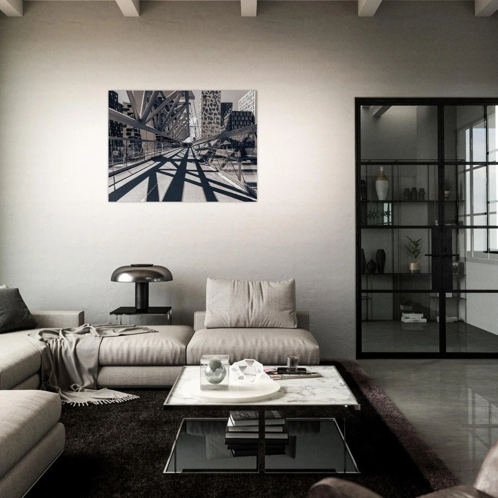 Discover our exclusive fine-art print featuring a stunning modern pedestrian bridge set against a backdrop of towering city buildings. This captivating piece showcases vivid colors and bold geometric shadows, expertly captured using advanced 12-color giclée printing technology. Perfect for art lovers and designers alike, this limited edition print is available in only 20 pieces per size, making it a unique addition to your collection.