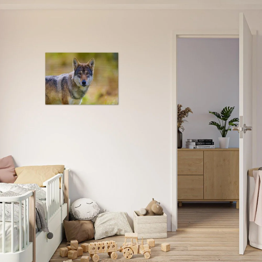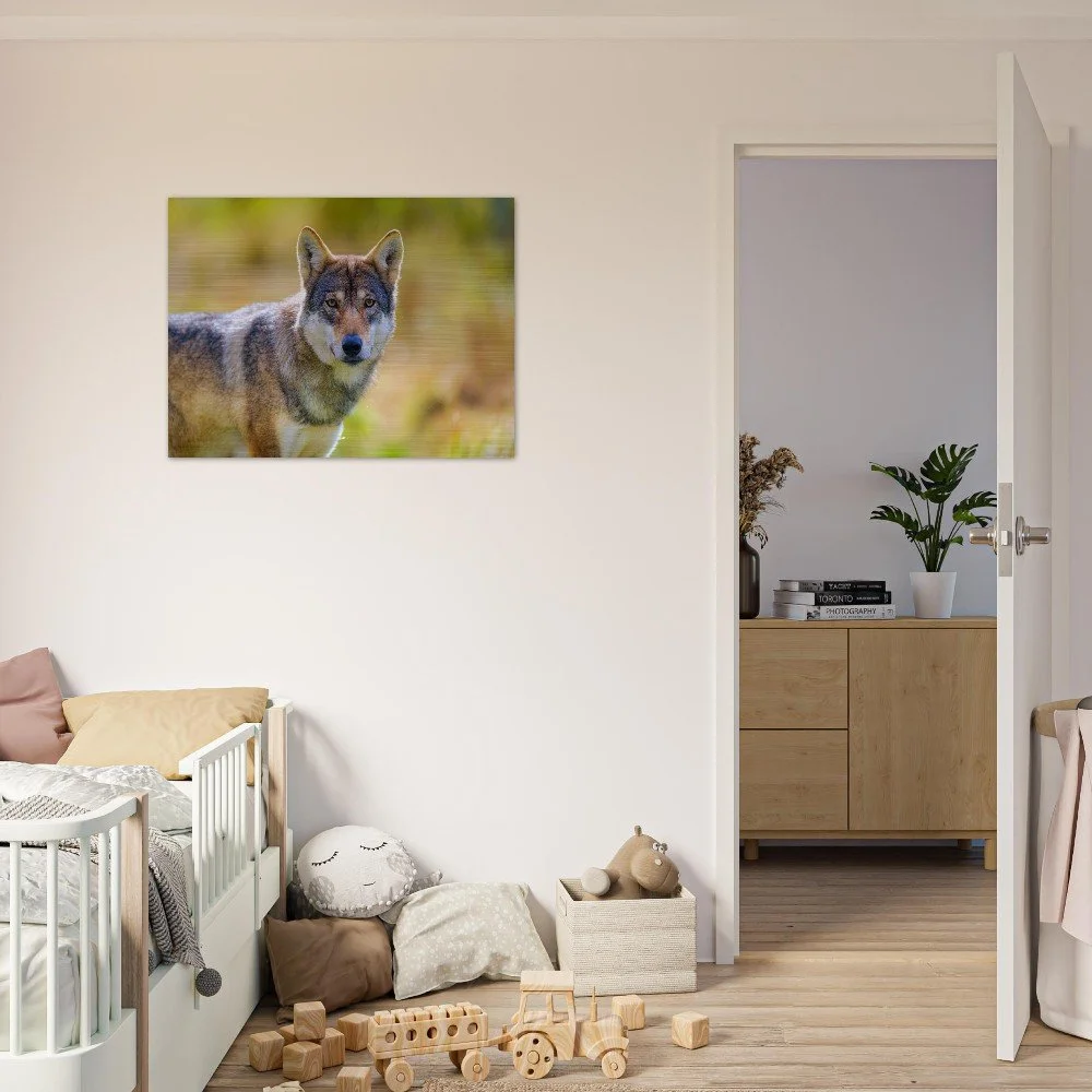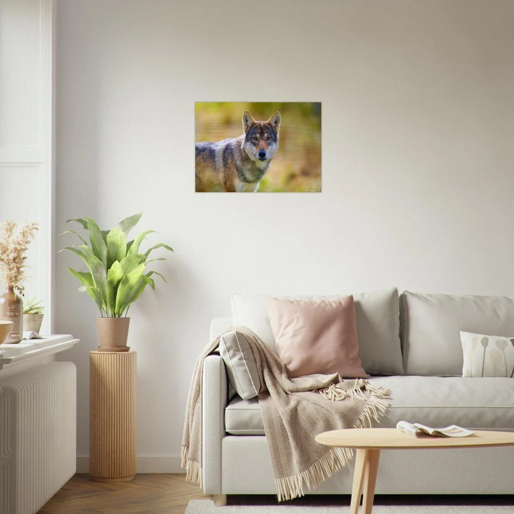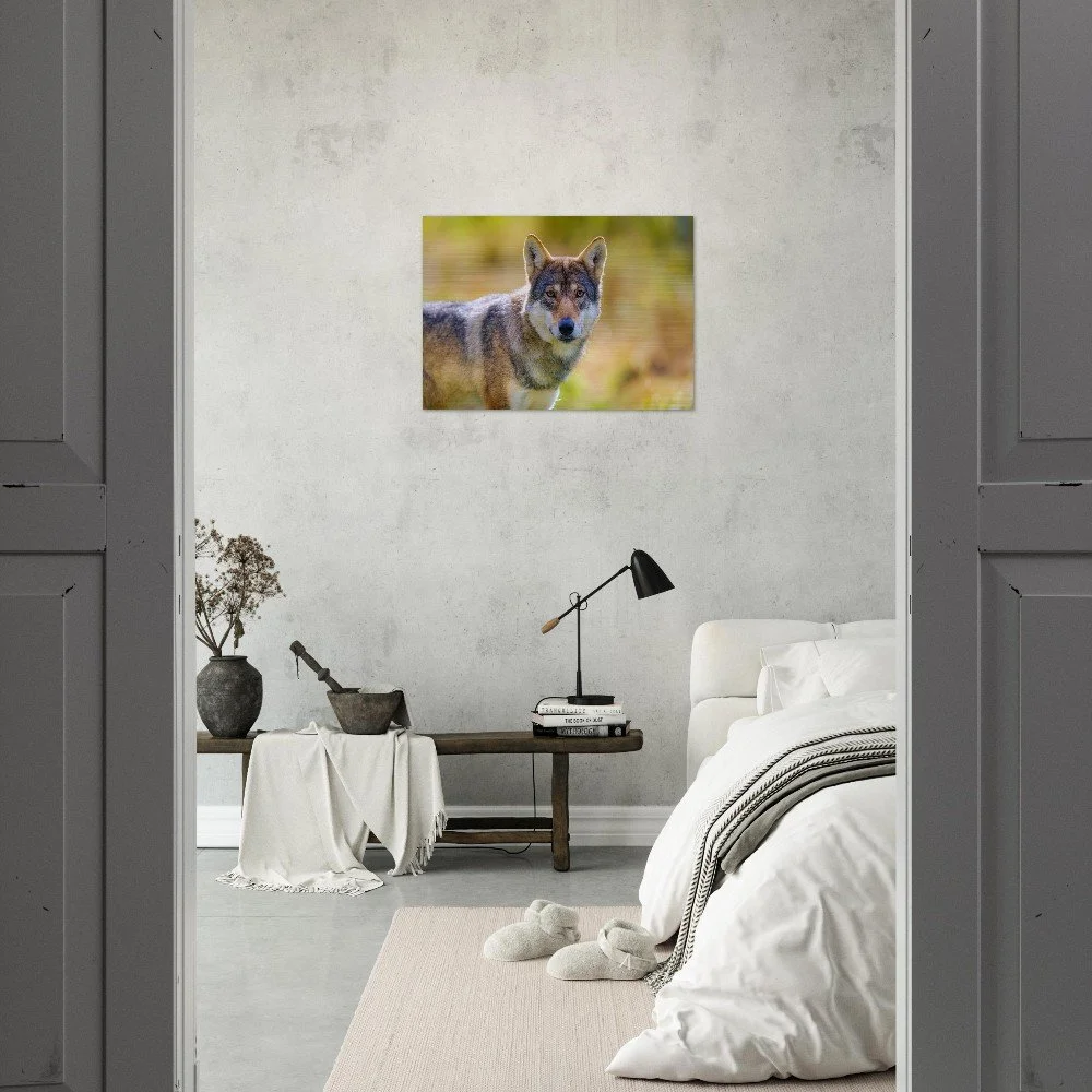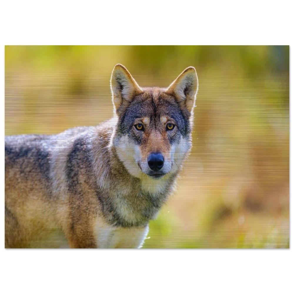 Witness the majesty of the wild with our stunning aluminum print featuring a wolf standing alert in soft golden light. Captured in sharp detail, the wolf's focused eyes and textured fur come alive against a blurred background, providing an eye-catching centerpiece for any room.