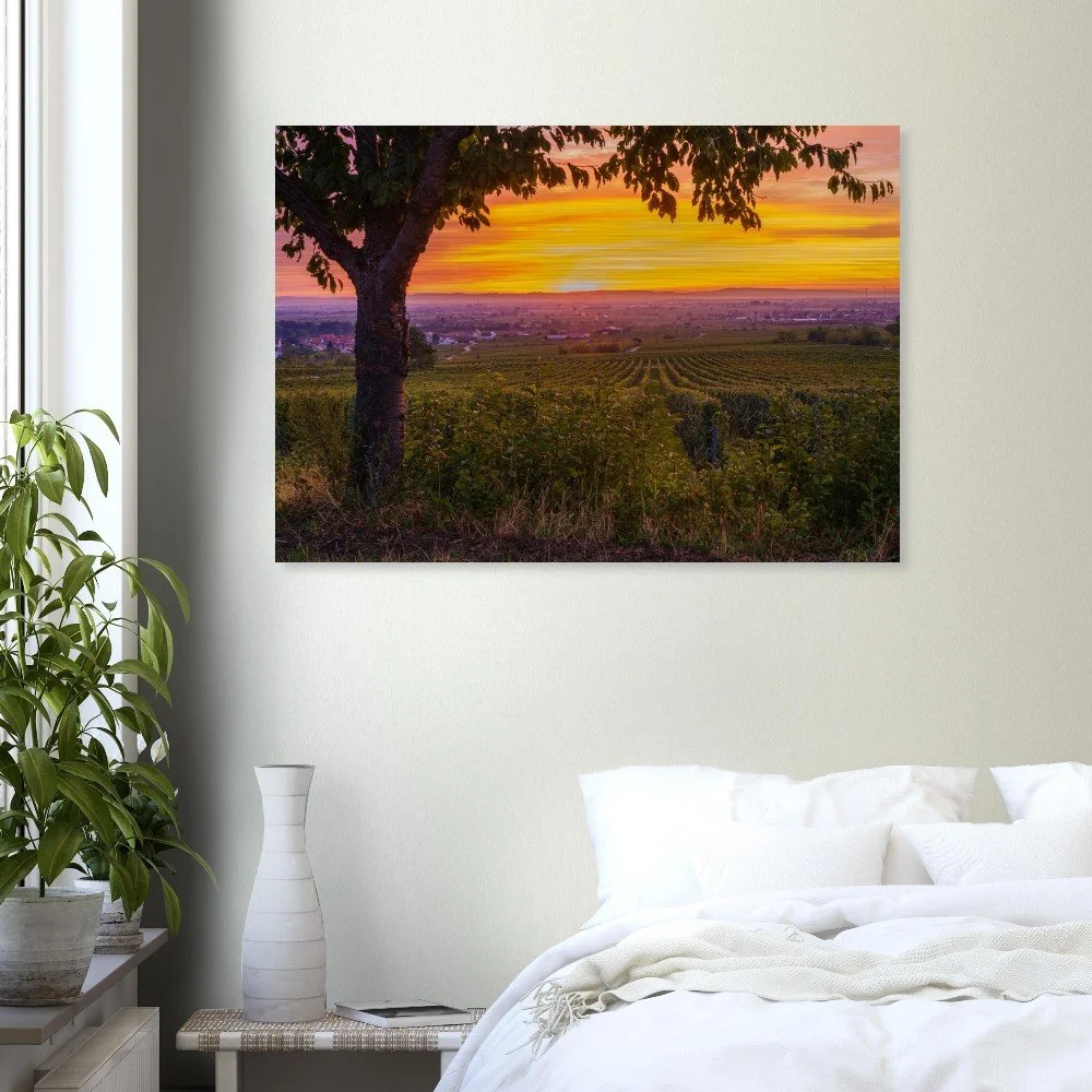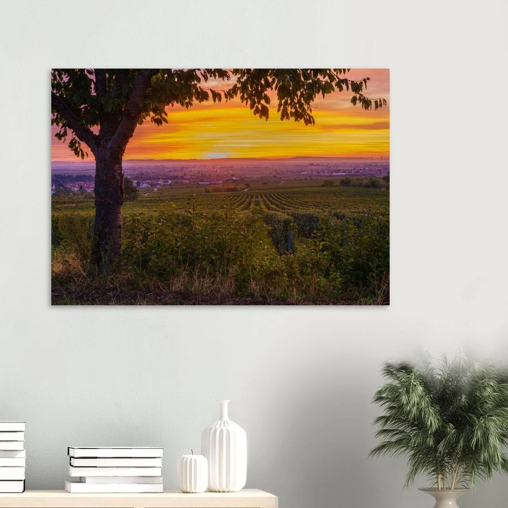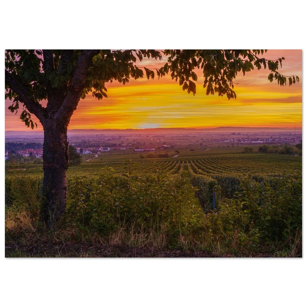 Transform your space with our mesmerizing aluminum print featuring a glowing sunrise stretching across the sky above rolling vineyards, framed by a tree in the foreground. Printed on brushed silver aluminum, this artwork offers a textured, industrial look, where colors beautifully interact with the metallic surface for a unique artistic effect.