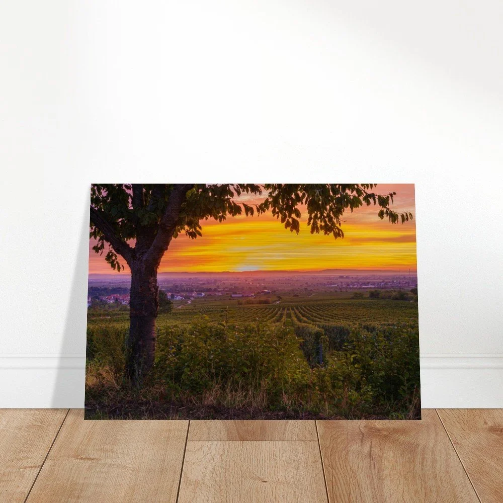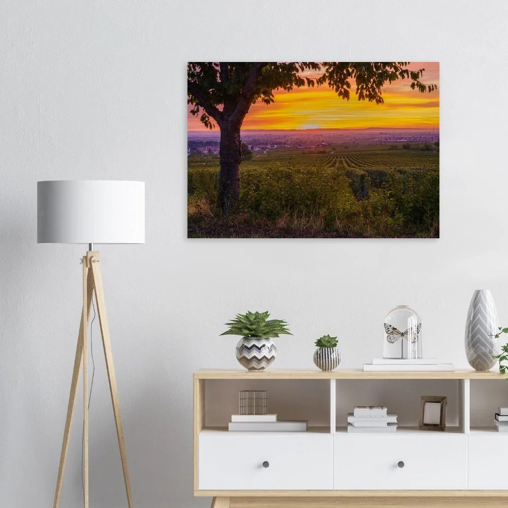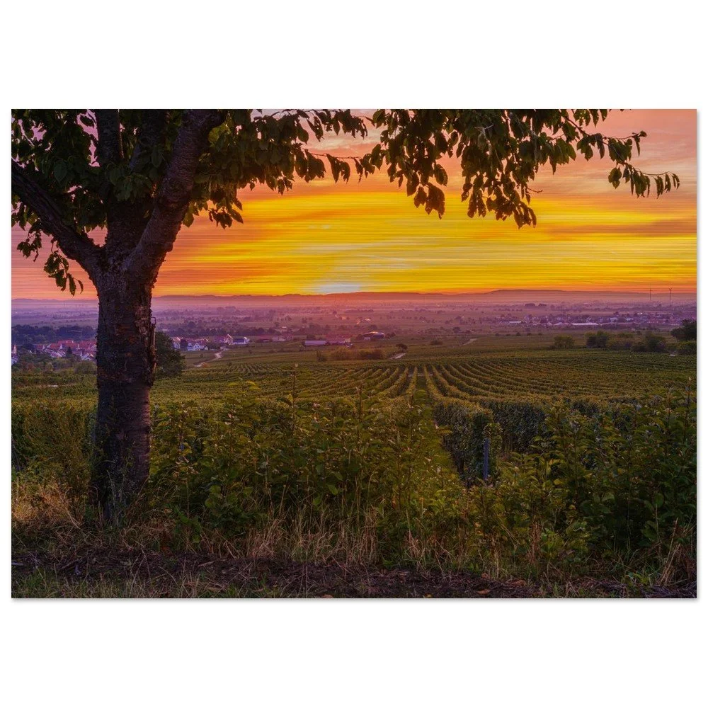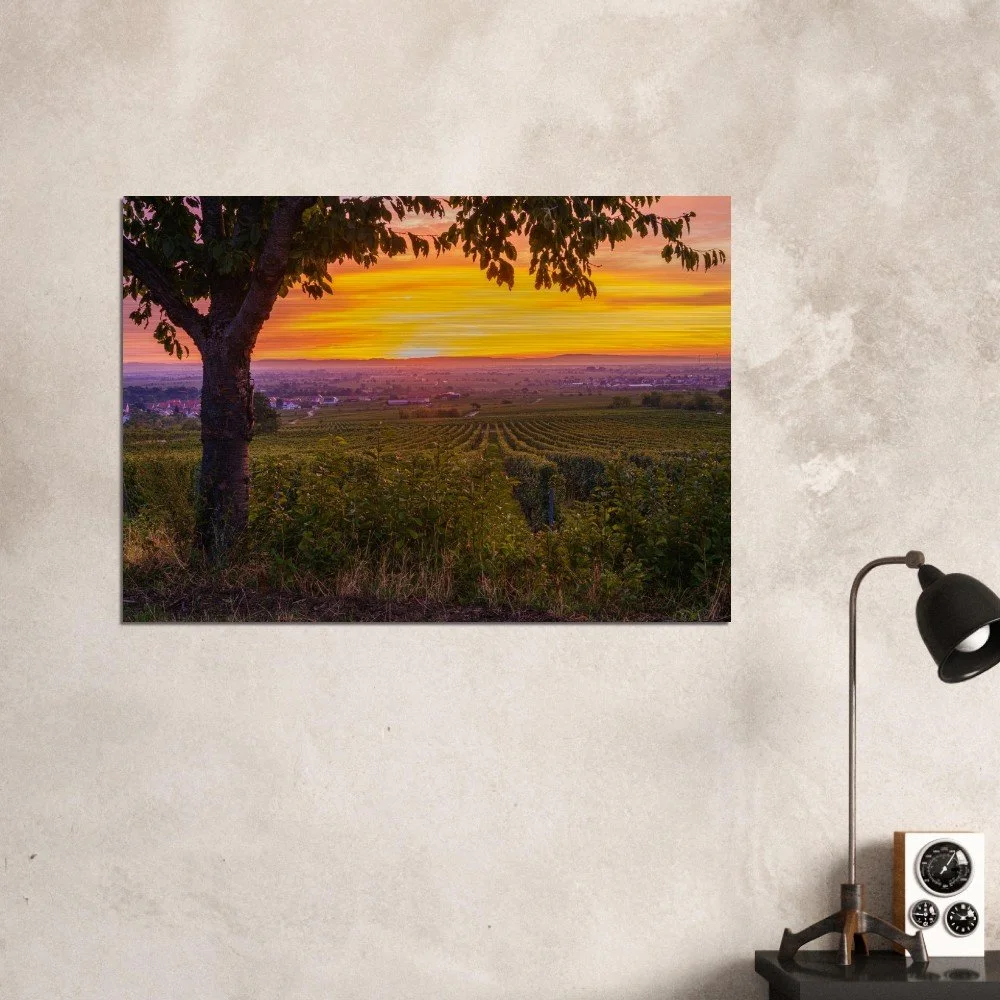 Transform your space with our mesmerizing aluminum print featuring a glowing sunrise stretching across the sky above rolling vineyards, framed by a tree in the foreground. Printed on brushed silver aluminum, this artwork offers a textured, industrial look, where colors beautifully interact with the metallic surface for a unique artistic effect.