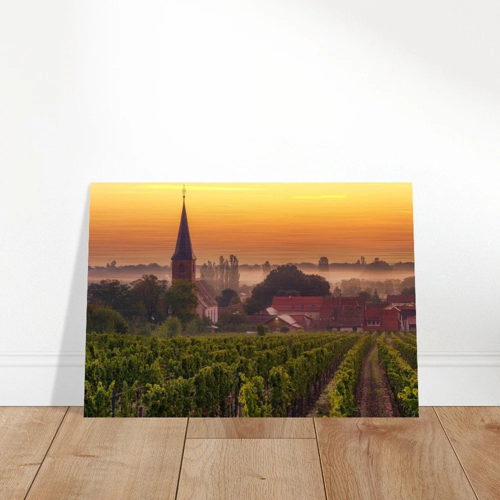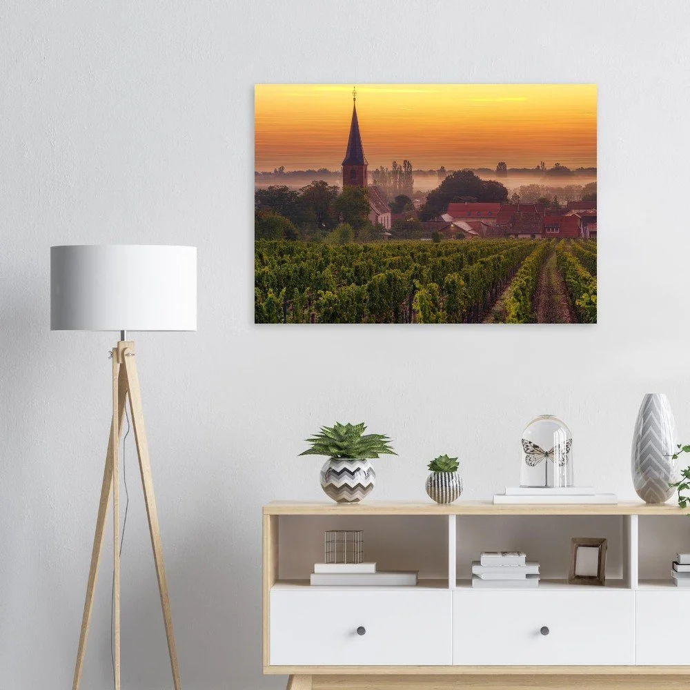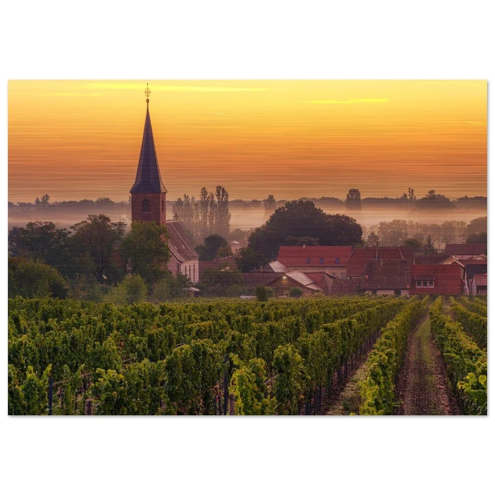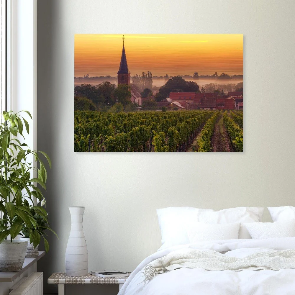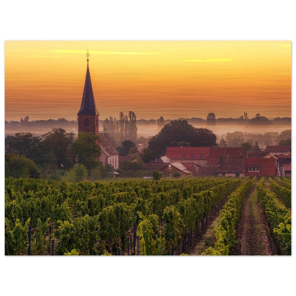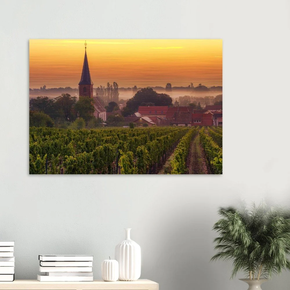 Transform your space with our stunning aluminum-print featuring a picturesque village church rising above lush vineyards at sunrise, enveloped in soft mist and warm golden light. This captivating artwork is printed on brushed silver aluminum, offering a textured, industrial aesthetic that enhances any modern or abstract decor.