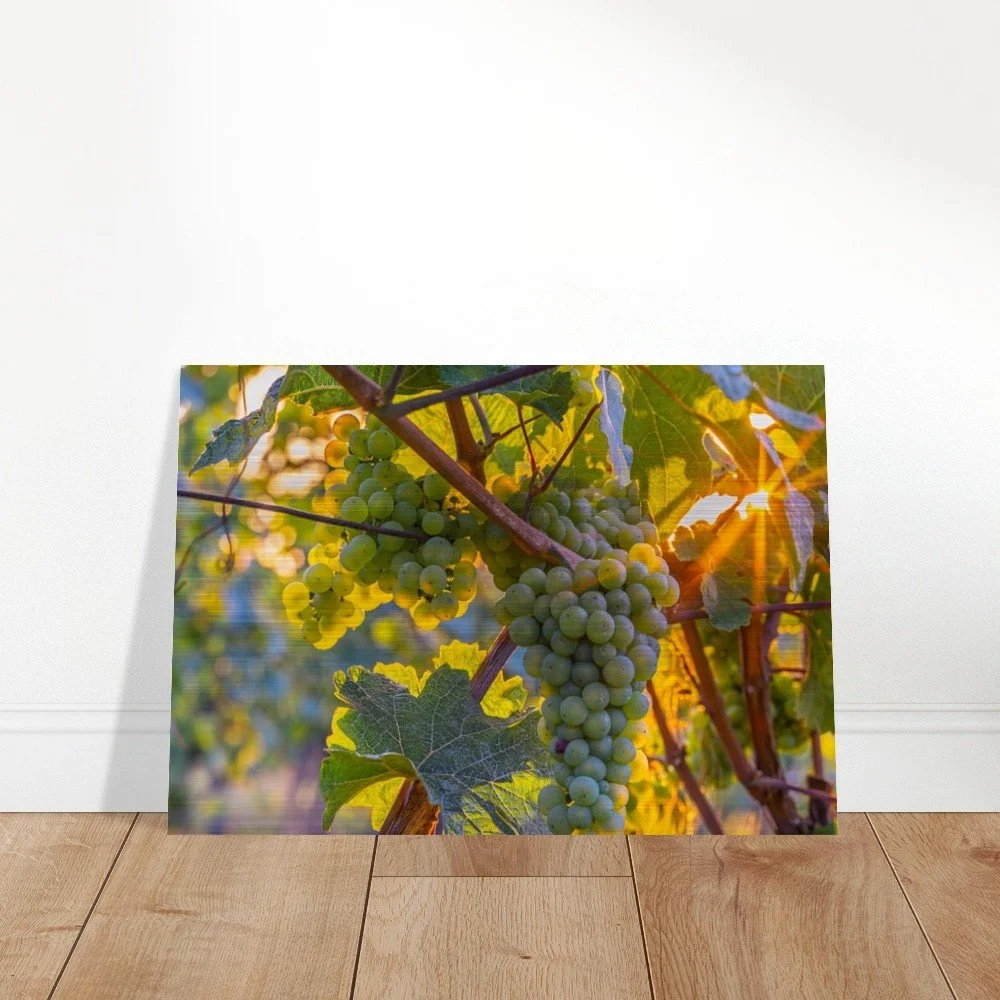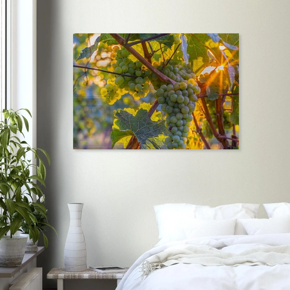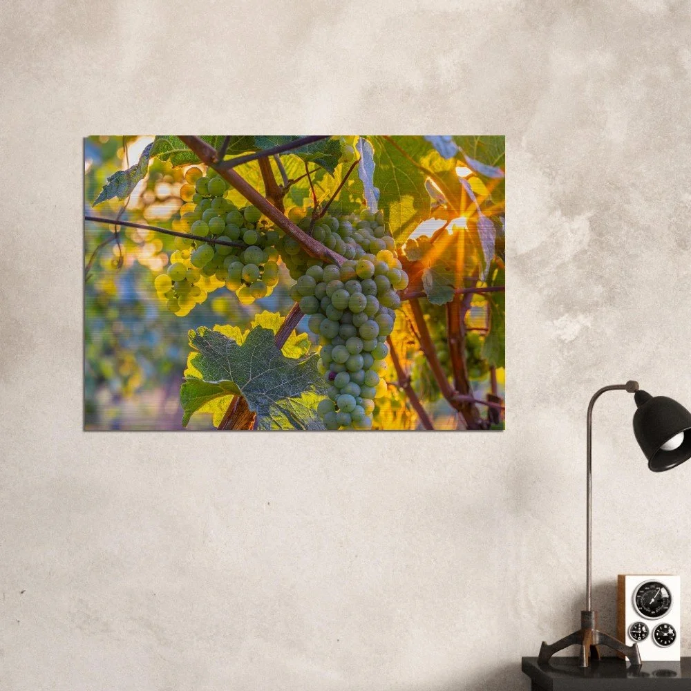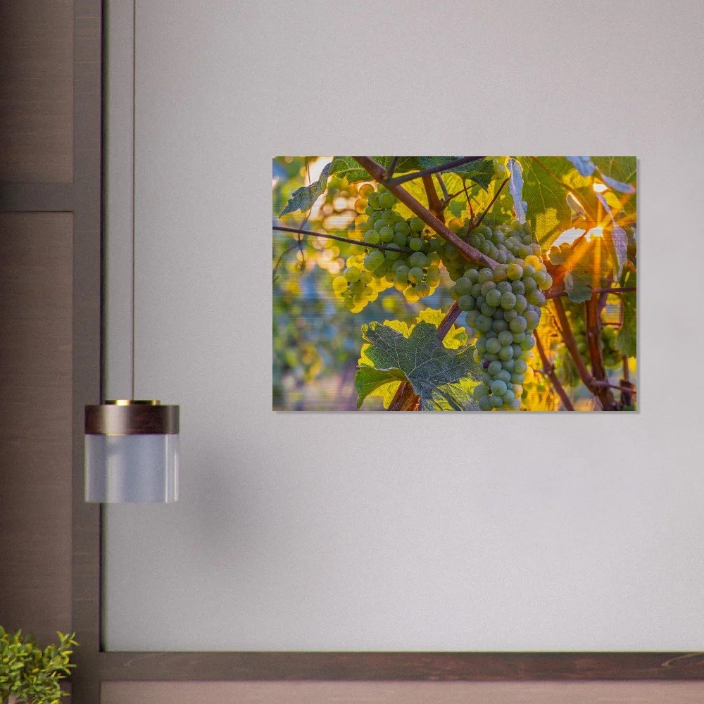 Bring the beauty of nature into your space with our stunning Aluminum Print featuring sunlight filtering through vibrant vine leaves, illuminating clusters of ripe green grapes nestled in a tranquil vineyard. This art piece captivates with its unique interplay of colors against a brushed silver background, making it a standout addition to any modern home or office decor.