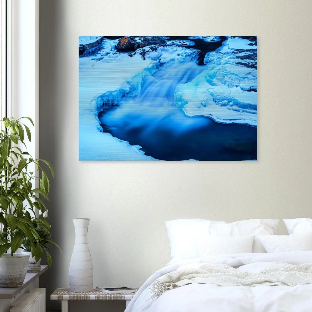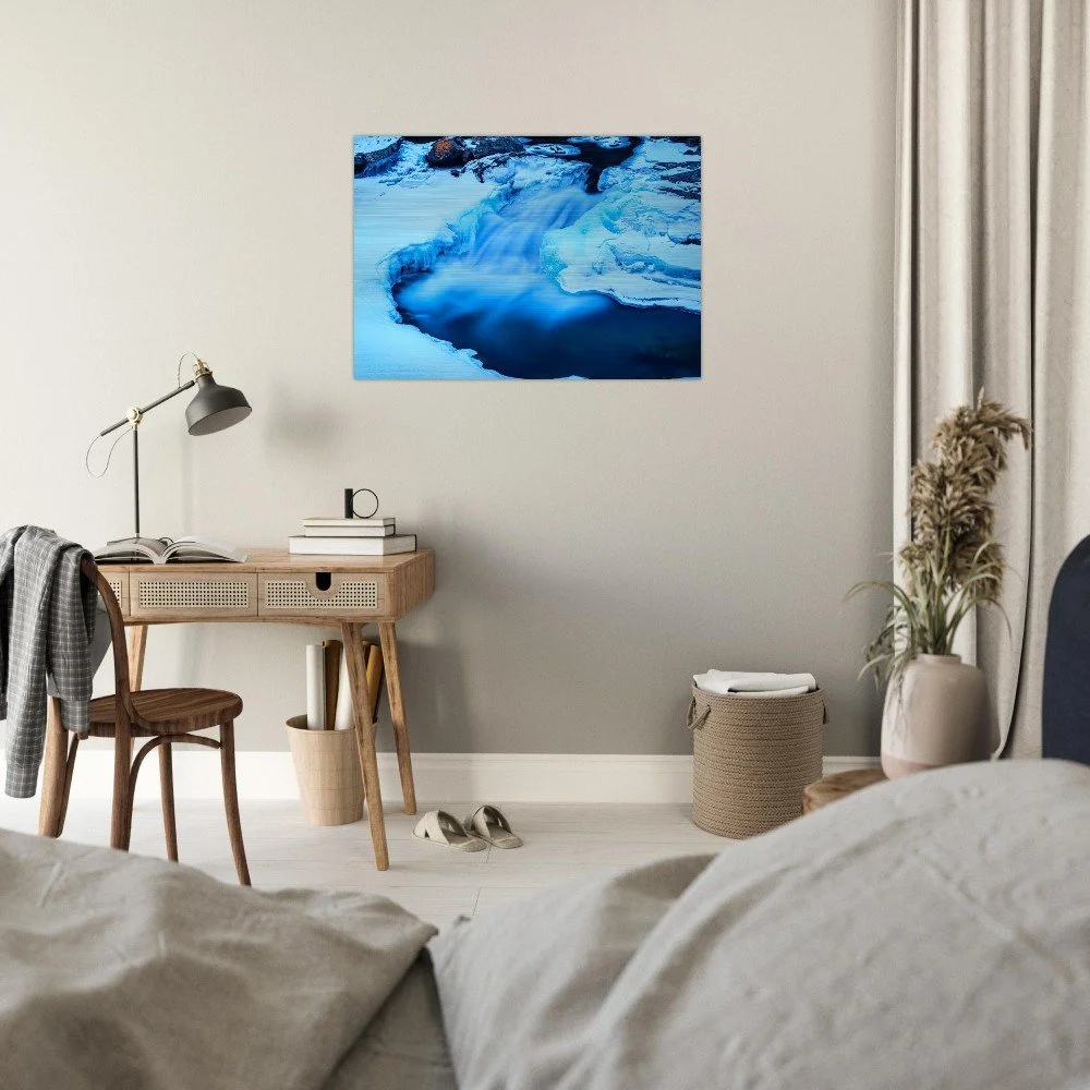 Experience the serenity of a winter waterfall with our stunning aluminum print, featuring a small waterfall flowing gracefully through thick layers of ice and snow. The deep blue tones create a mesmerizing contrast against the frozen landscape, making it a striking centerpiece for any room.